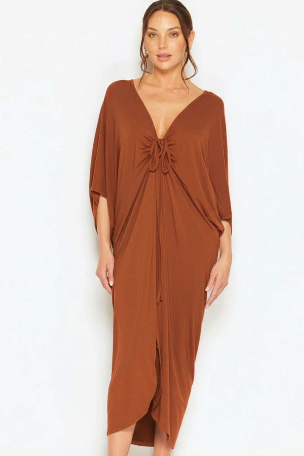 Maxi Kaftan - Copper: This copper maxi dress is made from natural modal, a soft, breathable fabric that feels comfortable all day. It has a simple V neckline, a gently gathered waist, and a full-length skirt that falls easily without feeling heavy. Designed and made in Australia, it’s an uncomplicated piece you can reach for on warm days or when you want something relaxed and easy to wear.