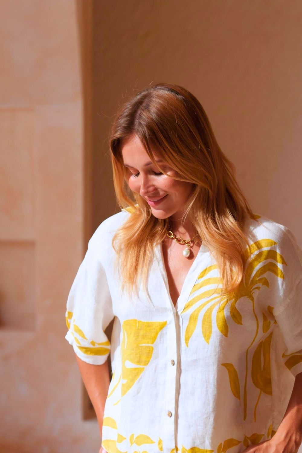 Bermuda Shirt – This baggy relaxed style shirt can be worn buttoned up or open with a bandeau or singlet underneath.  Made from soft natural linen, featuring a yellow and white hand painted print.  Pair with the matching shorts for a fun summer look.