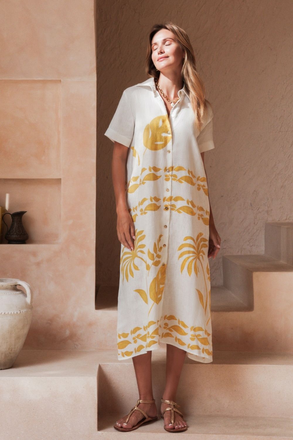 This Shirt-maker style dress with a collar and button-up front, is perfect for our summer season. Fresh and bright the fabric has been hand painted with a tropical leaf design.