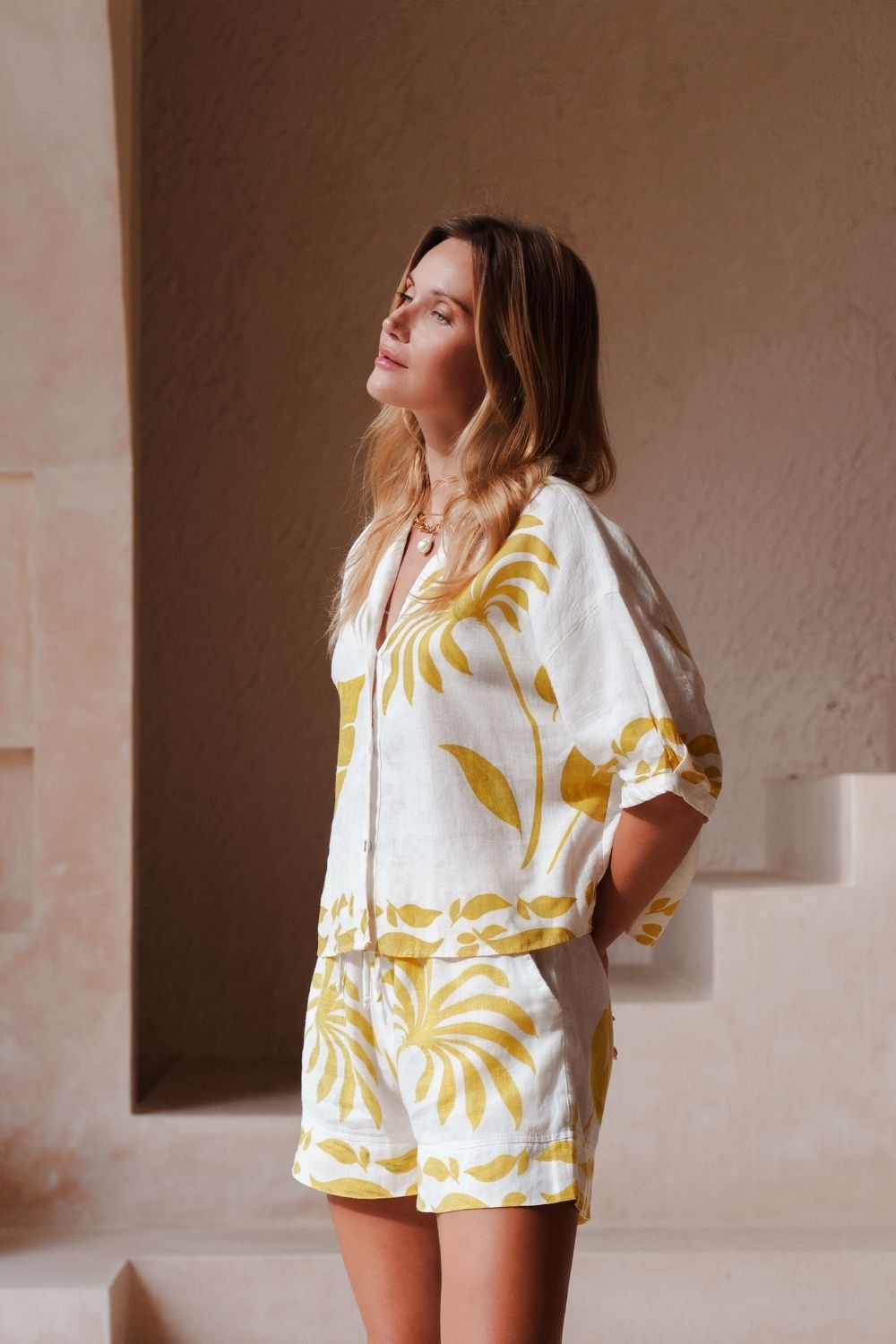 Shorts – These lightweight summer shorts made from soft natural linen are designed with an elastic waist for ease and comfort.  The yellow and white hand painted print also comes in  the matching button-up shirt which gives this set a fun 'Summer feel'