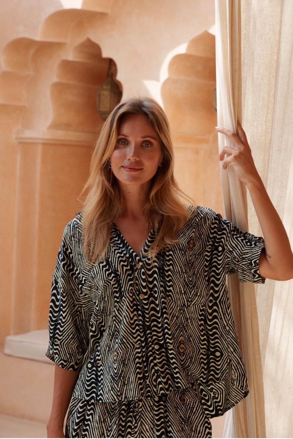 Ziggy Shirt: has a relaxed button-up design that can be worn open as a loose jacket. The aztec print has been delicately beaded for a subtle but elegant look. Lightweight, breathable, and perfect to wear through our hot summers. For a total look pair back with matching pants. The versatile print means accessories can be simple or statement.